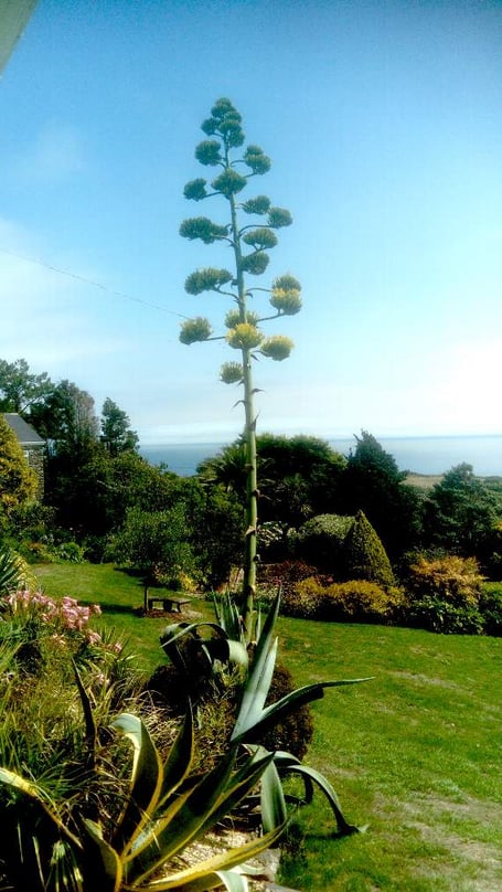 The flowering Agave is rare in the UK, it only flowers once at the end of its life, after decades of growth. The three-and-a-half acres of sub-tropical gardens are in a stunning location with 180 degree view of the sea at Prawle Point.