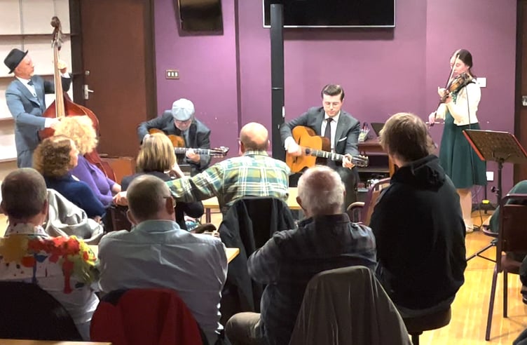 The set kicked off with the Django Reinhardt’s Stompin’ at Decca, which was apparently composed and recorded in one take to fill some vinyl space left at the end of a recording session at Decca Records. Then followed Dino Olivieri’s J’attendrai, Sidney Bechet’s Si tu vois ma mere and band member Laurie Light’s Eddie and Joe and the glorious Nuages by Django (this reviewer’s all-time favourite). As you would expect, some of the best-known tracks of the Reinhardt/Grappelli gipsy jazz and swing era were included in the session but it was great to see that the band had introduced some new material. The standout track of these was La Bikina by Ruben Fuentes, a catchy mariachi number underpinned by tight syncopation and infectious guitar riffs. No wonder it was a popular dance hit in the Spanish speaking world and also included in the Disney film Coco.