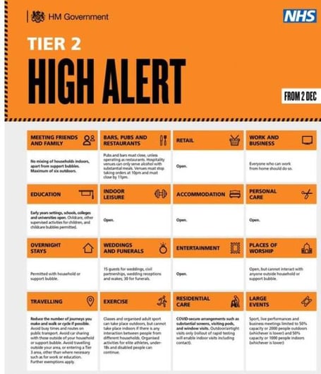 The tier 2 measures mean you must not socialise with anyone you do not live with or who is not in your support bubble in any indoor setting, whether at home or in a public place. You can socialise though in a pub beer garden, but pubs and bars must close, unless operating as restaurants and hospitality venues can only serve alcohol with substantial meals.”