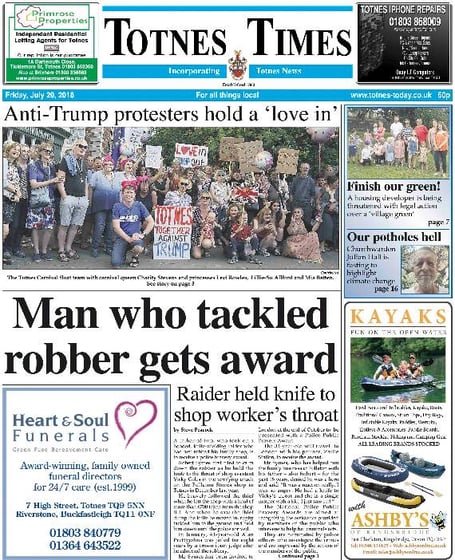 This week the Totnes Times leads with the story of a police award going to shopkeeper Robert Symes who tackled an armed robber.