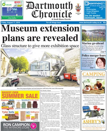 This week’s Chronicle leads with news plans have been submitted by BBH Architects, acting on behalf of Dartmouth Museum, for an innovative solution to the museum needing extra space – a glass and steel extension on the rear of its Duke Street premises.