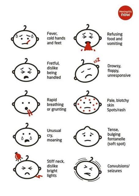 Symptoms of meningitis and septicaemia may include: high temperature, cold hands and feet, vomiting, confusion, breathing quickly, muscle and joint pain, pale, mottled or blotchy skin, spots or a rash, headache a stiff neck, a dislike of bright lights, being very sleepy or difficult to wake and fits (seizures).