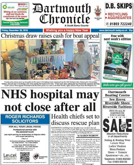 We lead on the dramatic news that Dartmouth and Kingswear Hospital, which is under threat of closure, may yet stay open under a proposal put forward by Healthwatch, the consumer champion for health and social care. The idea is due to be considered by local NHS chiefs.
