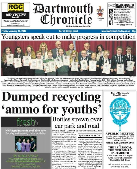 This week we lead on a police report of youths throwing bottles left alongside recycling bins in Townstal across the car park and roads.