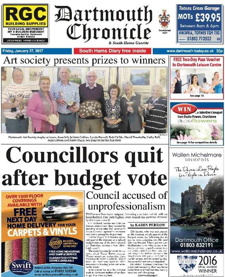 We lead on the news that two Dartmouth town councillors have resigned following last week’s budget meeting which agreed at 64 per cent increase in the amount the town will charge in council tax.