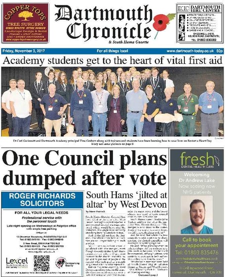 We lead on news of South Hams District Council’s vote in favour of the One Council merger proposal, which was thwarted when, unexpectedly, West Devon Borough Council voted against the plans.
