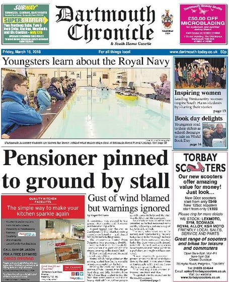 Our lead story focusses on a accident in Dartmouth’s Old Market. A gust of wind caused a large market stall to topple over, trapping a 77-year-old man by his neck – and, as water poured off its awning, soaking him too.
