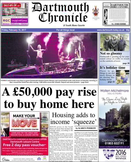 House prices are 14 times the average salary in the South Hams, Dartmouth dentists Justin Marney and Azud Irshad have successfully rowed 3,000 miles across the Atlantic, and all the things you can do over the upcoming holidays, plus much more inside...