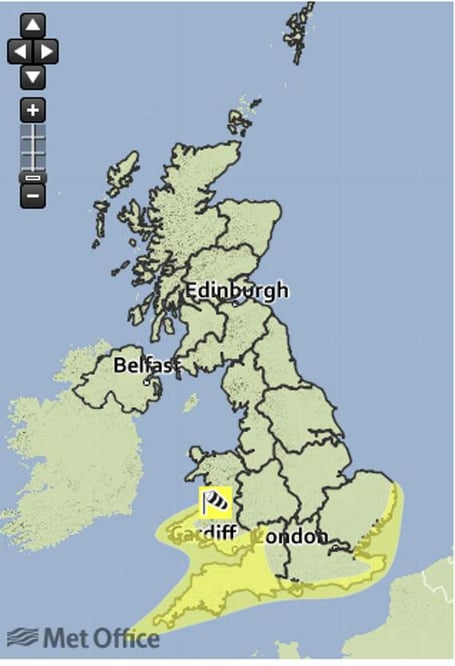 A spokesman said this morning: ’A spell of unseasonably strong southwesterly winds, accompanied by heavy, blustery showers, is expected to develop across the south of the UK later on Friday. Winds will peak early on Saturday through the Bristol Channel area, before slowly transferring east across the south of England. Additionally the strongest winds will lead to large waves around exposed coastlines.