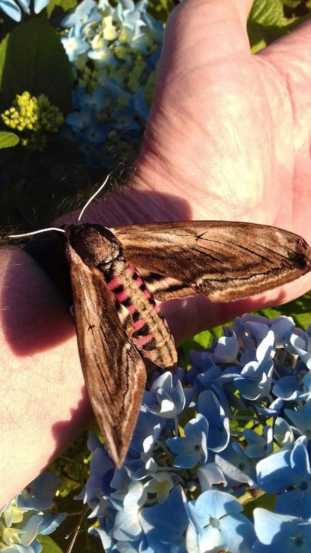 In our previous story, we think we have narrowed down the species to a Privet Hawk Moth caterpillar, and now Chris Preece thinks he’s found a Privet Hawk Moth in his garden in Malborough. He took some photos and also a stunning short video of it fluttering its wings, which you can see below.