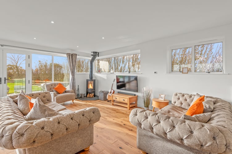 On the entrance level is a bright and free-flowing open plan living space, with a lounge that has French doors to the garden and a log-burner.