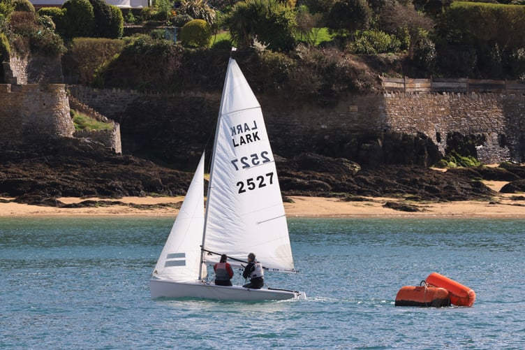 No wind, lots of wind, too much wind, not to mention the sun, rain, and hail—you name it, he had it. He settled for 5-X-5-X-5, with the X mark being placed in the middle of the estuary between the line and Millbay. Tim Fells and Frances Gifford, sailing a Lark, were joined by the two Merlin Rockets of Andrew and Tris Squire along with John Burn and James Greenhill.